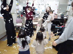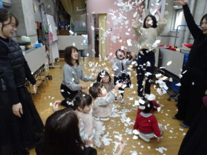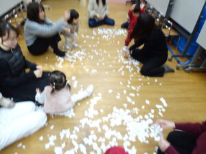 何度も紙を集めては、雪をたくさん降らせて大喜び (^^♪