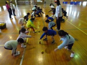 その後、各チームに分かれて、全員、スポンジボールのテニスをしました。