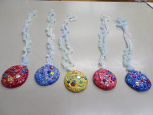 粘土にみんなの大好きなキラキラを付けて、ペンダントを作りました。